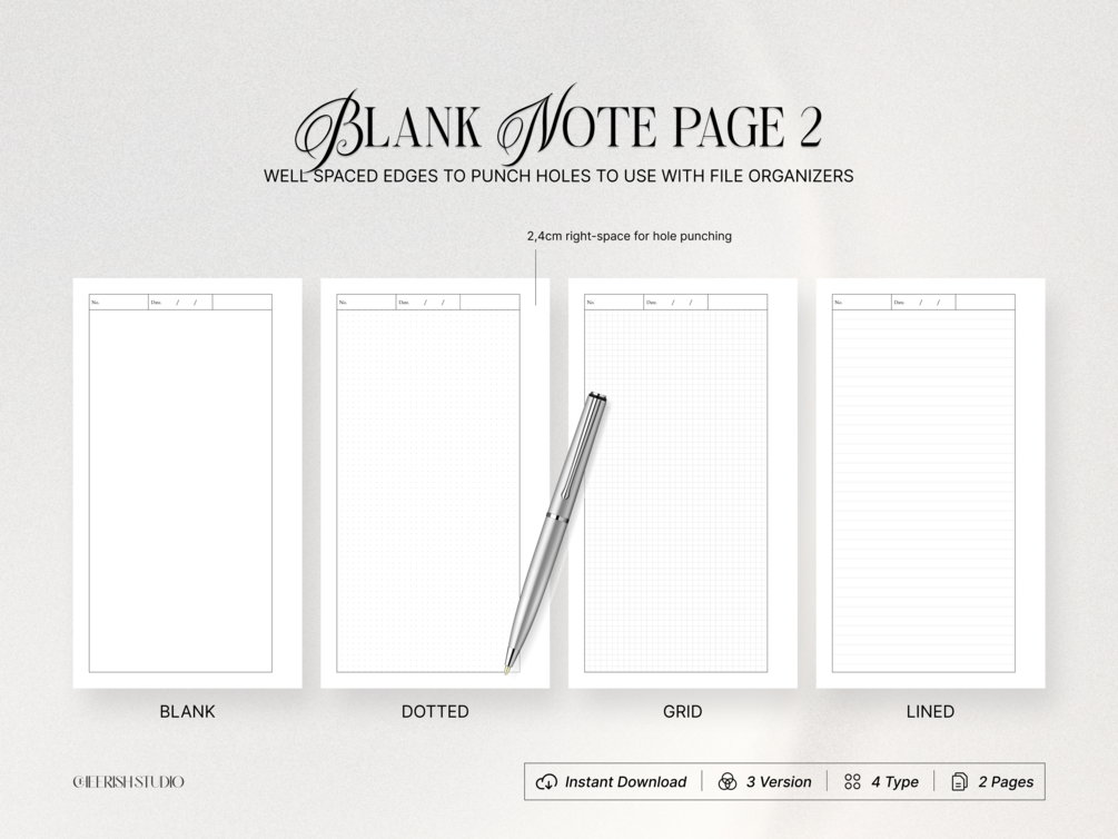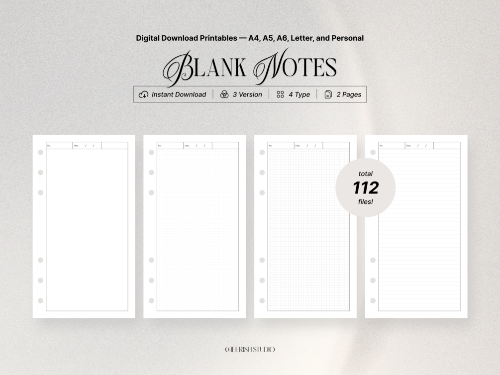 Blank Note for Organizer Inserts, Planners, and Binders - Dotted, Grid, and Ruled Lines - A4, A5, A6, Letter and Personal Sizes