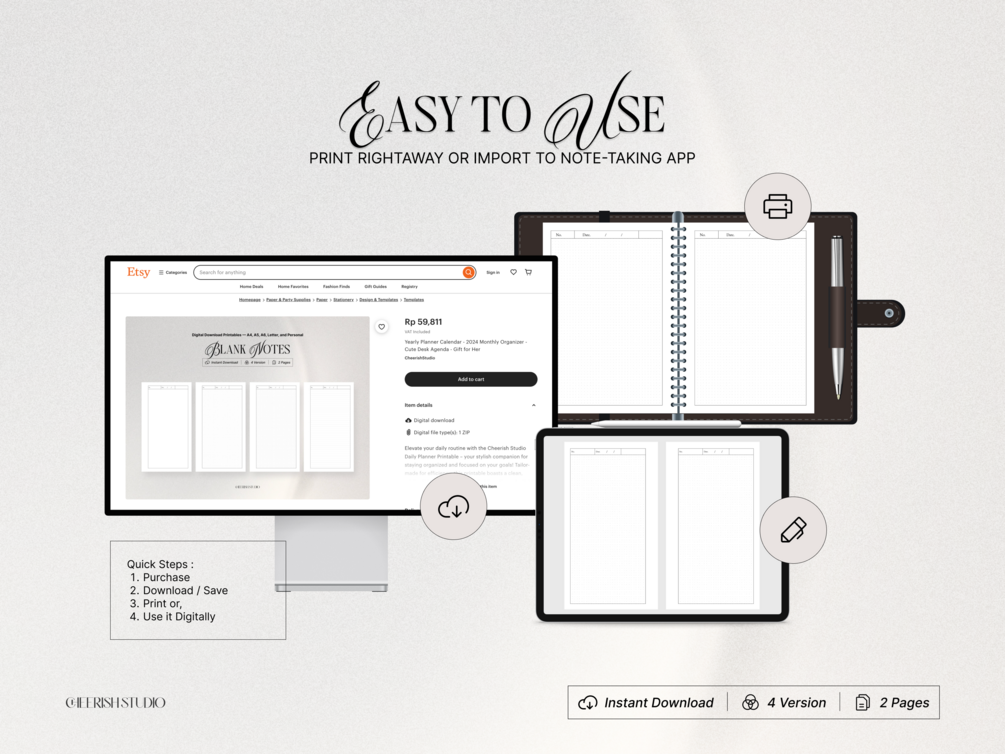 Elevate your daily routine with the Cheerish Studio Daily Planner Printable – your stylish companion for staying organized and focused on your goals! Tailor-made for efficiency, this printable boasts a clean, minimalist design with customizable options. Available in five sizes and compatible with popular apps, it's perfect for students, professionals, or anyone embracing the power of organization. Download instantly after purchase, and get ready to make each day count!